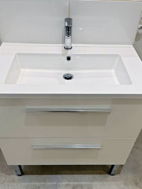 - Rénovation complète de la salle de bain : suppression du bidet, pose d'un meuble vasque et d'une douche avec receveur extra-plat, remplacement du radiateur d'origine par un sèche serviettes.